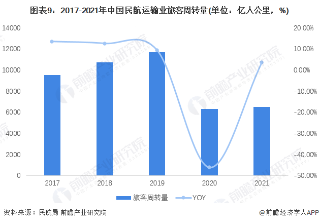 2021年,全行业完成旅客周转量6529.68亿人公里,较2020年增长3.5%。其中国内航线完成旅客周转量6439.12亿人公里,占比98.61%,较2020年增长9.7个百分点;国际航线的旅客周转量下滑79.5%,仅有90.56亿人公里。