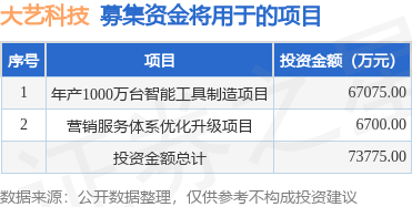 江苏大艺科技股份有限公司(简称:大艺科技)拟在深交所主板上市,募资总金额为6.13亿元,保荐机构为中信建投证券股份有限公司。募集资金拟用于年产1000万台智能工具制造项目、营销服务体系优化升级项目,详见下表: