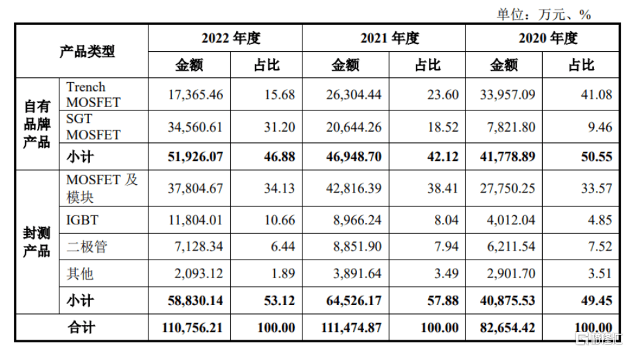 具体来看,报告期内,公司产品包括功率器件自有品牌产品和功率器件封测产品,两类产品收入占比差异较小,2020 年度基本持平;2021年度、2022年度,封测产品收入占比略高于自有品牌产品。