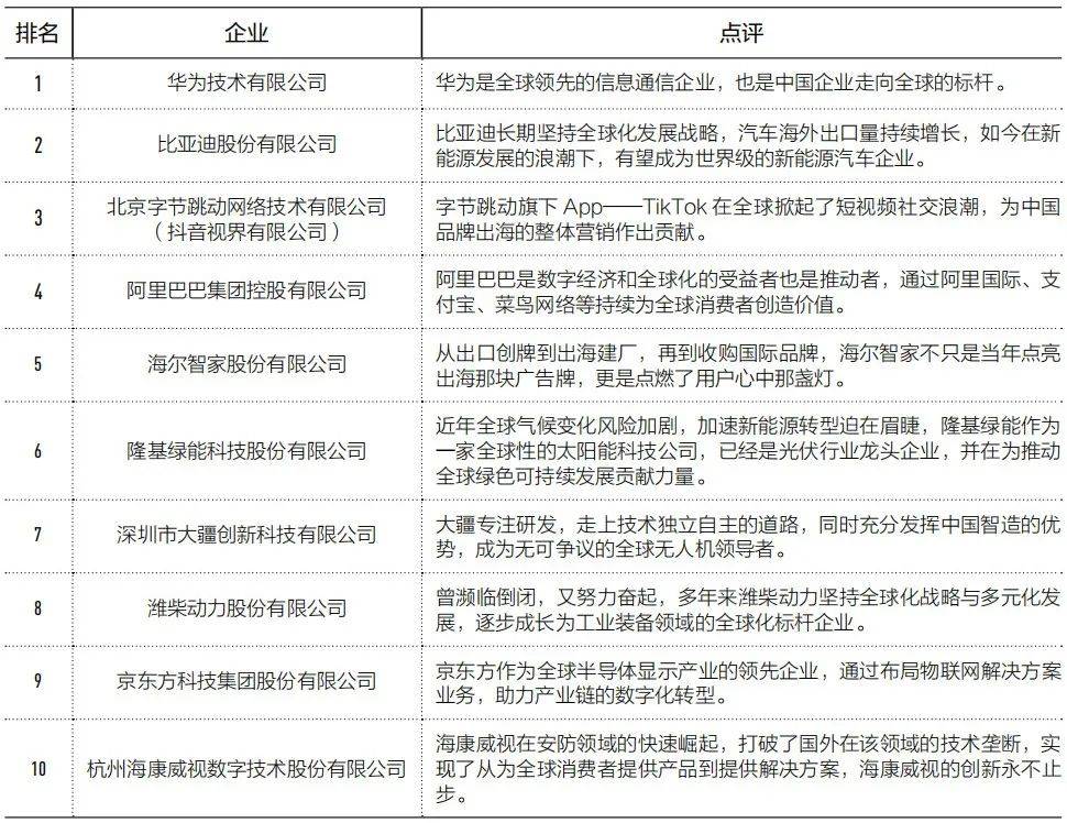 表1: 第一财经研究院·2022 中国企业全球化十佳企业