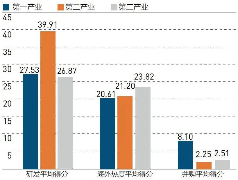 分行业来看,第二产业企业全球化综合得分更高,这与工业产品的可贸易性有关,更容易参与全球价值链分工;不同行业的发展路径也有差异,样本数据显示,第二产业更注重研发投入,而服务业企业在品牌建设方面相对领先。