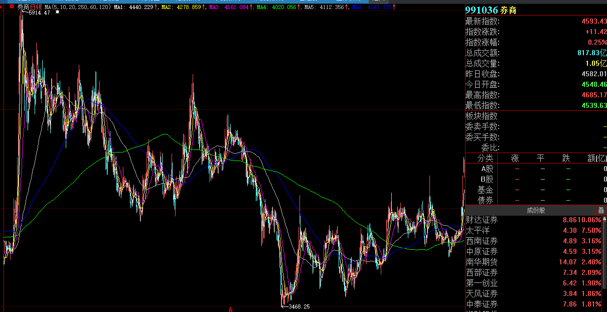 而其他体量较大的券商股,如中信证券、东方财富、光大、银河、华泰、中金公司、国泰君安等,全部都在调整。
