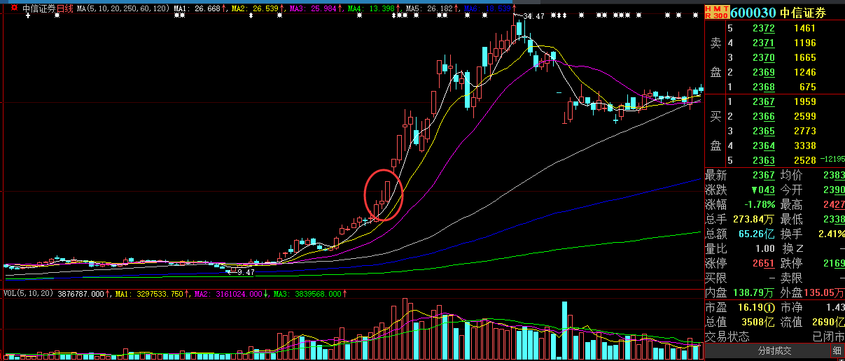 那么,为什么2014年~2015年的牛市行情中,中信证券一旦出现涨停,接下来还能掀起巨大的涨幅,并且真正成为“牛市旗手”?