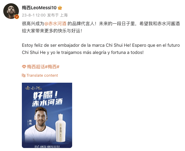 8月1日,阿根廷足球运动员梅西通过其个人微博宣布,其成为赤水河酒的品牌代言人。