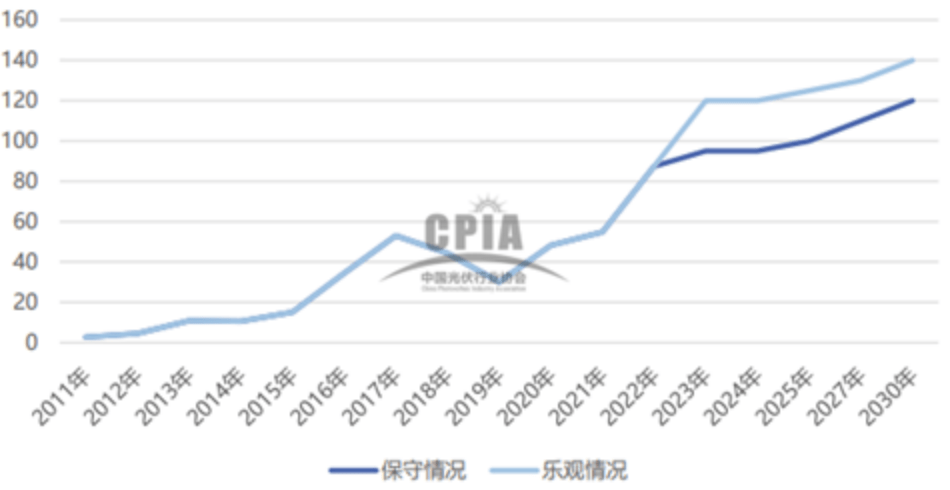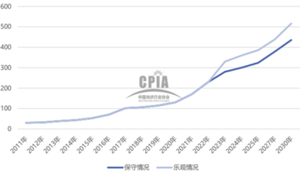 全球已有多个国家提出了“零碳”或“碳中和”的气候目标,发展以光伏为代表的可再生能源已成为全球共识,再加上光伏发电在越来越多的国家成为最有竞争力的电源形式,预计全球光伏市场将持续高速增长。。根据中国光伏行业协会数据,全球新增光伏装机容量从2011年的30.2GW增长至2022年的230GW,年复合增长率20.27%。2022年全球光伏累计装机容量突破1,100GW,光伏装机量大幅上升。在全球气候变暖及化石能源日益枯竭的大背景下,可再生能源开发利用日益受到国际社会的重视,大力发展光伏能源已成为世界各国的共识。根据中国光伏行业协会预测,保守情况下,2030年全球光伏年均新增装机将达到436GW,乐观情况下将达到516GW,具体预测情况如下所示: