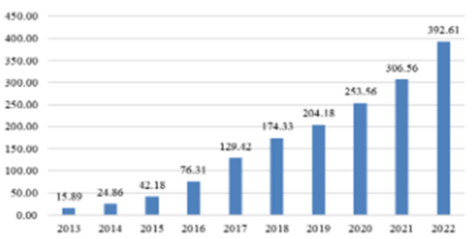近年来,在光伏“平价上网”、光伏行业“降本增效”以及国家对光伏产业扶持力度不断加大等因素的驱动下,光伏装机容量持续增长。根据中国电力企业联合会数据,2022年光伏累计装机容量已达到392.61GW,同比增长28.07%。预计 2023 年光伏新增装机量超过 95GW,累计装机有望超过 487.6GW。