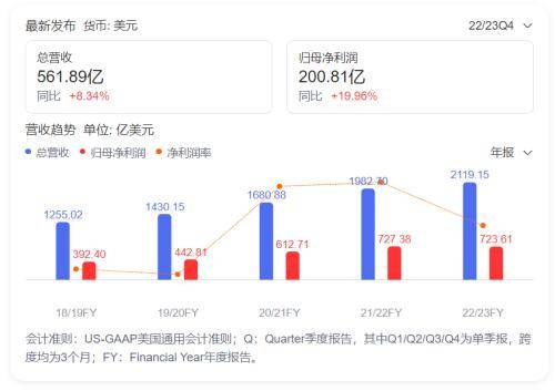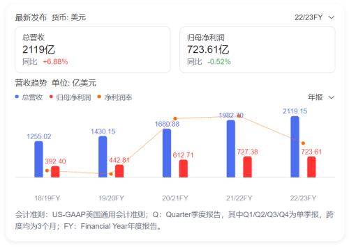 在2023年全年,微软实现总营收2119亿美元,同比增长7%,净利润724亿美元,同比下降0.5%。