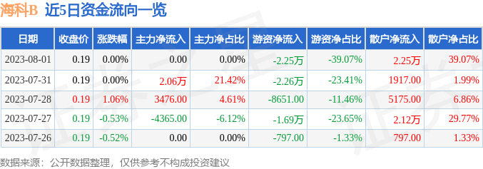 8月1日的资金流向数据方面,无主力资金净流入,游资资金净流出2.25万元,占总成交额39.07%,散户资金净流入2.25万元,占总成交额39.07%。