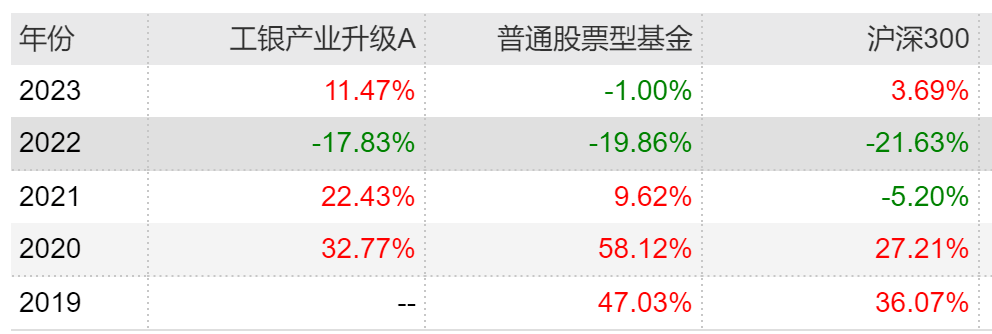 工银产业升级股票A成立于2019年12月25日,一直由陈小鹭管理,任职以来回报为48.79%,分年度来看,过去三个完整年度都跑赢了沪深300,回撤方面也控制得比较好,比如在去年大跌的市场中,净值整体下跌了17.83%,表现也强于普通股票型基金和沪深300。