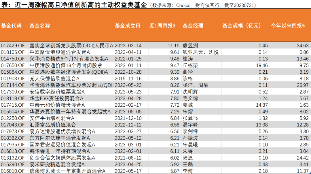 我们选取了净值创新高且近一周涨幅排名前20的基金。