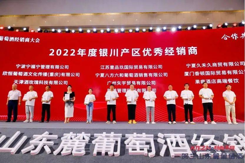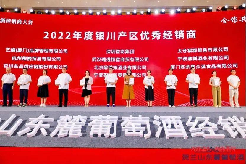宁波宁福宁管理有限公司、欣恒葡萄酒文化传播(重庆)有限公司、天津酒玫瑰科技有限公司、 江苏壹品玖国际贸易有限公司、宁夏八方六和葡萄酒销售有限公司、广州矢宇贸易有限公司、 睐普管理顾问有限公司、宁夏久禾久商贸有限公司、 厦门香顿国际贸易有限公司、果疯酒店高端餐饮、艺通(厦门)品牌管理有限公司、杭州程捷贸易有限公司、百川名品供应链股份有限公司、深圳首彩集团、武汉瑞通恒富商贸有限公司、北京醉鹅娘酒业有限公司、宁夏斟酌新零售有限公司、太仓福郡贸易有限公司、宁波鼎樽酒业有限公司、厦门陈余詹众诚食品有限公司一共20名经销商获得2022年度贺兰山东麓葡萄酒银川产区优秀经销商的荣誉称号。