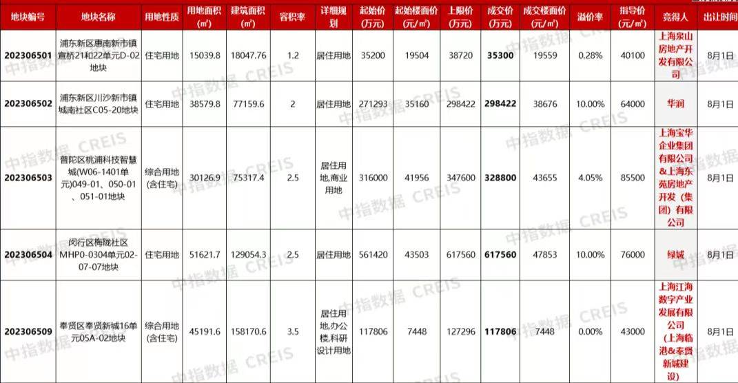 此外,上海泉山房地产开发有限公司以3.53亿元拿下浦东新区惠南地块,溢价率仅为0.28%。上海宝华+上海东苑以32.88亿元摘得普陀区桃浦智慧城地块,溢价率4.05%。上海江海数字以底价11.78亿拿下奉贤新城16单元05A-02地块。