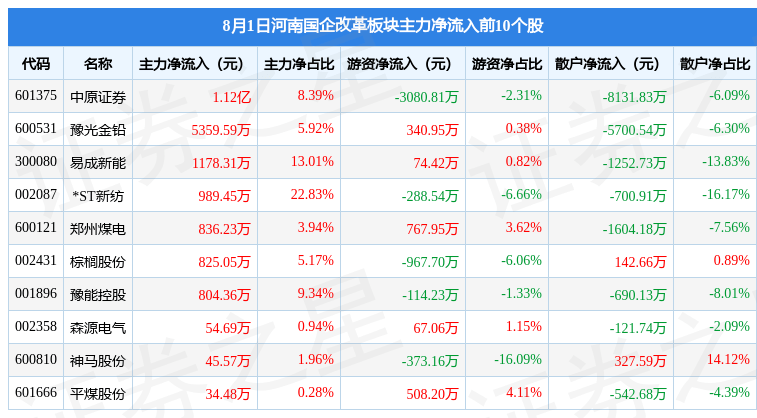 从资金流向上来看,当日河南国企改革板块主力资金净流入1.1亿元,游资资金净流出3200.27万元,散户资金净流出7819.85万元。河南国企改革板块个股资金流向见下表:
