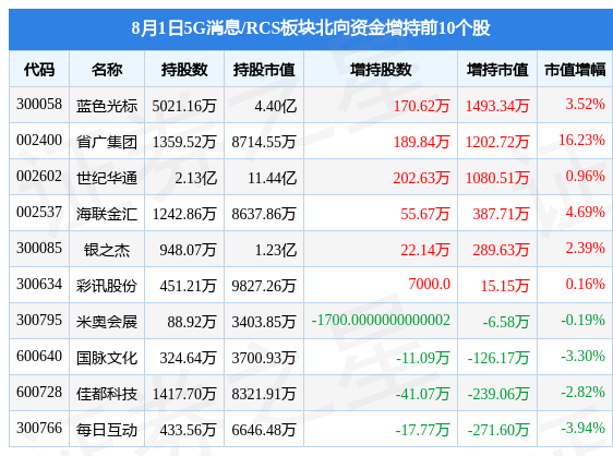 北向资金方面,当日5G消息/RCS板块北向资金持股市值为97.01亿元,减持2.12亿元。其中增持最多的是蓝色光标,增持了0.15亿元。减持持最多的是中兴通讯,减持了1.77亿元。5G消息/RCS板块北向资金持股变动明细见下表:
