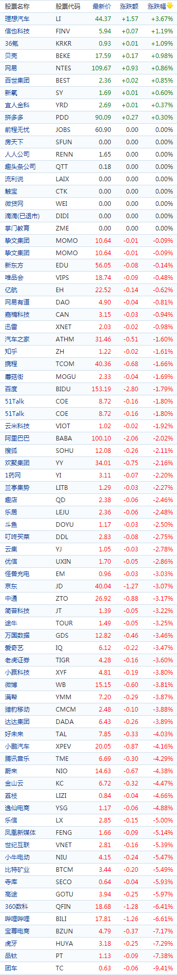 趣活,寺库,凤凰新媒体,优品车,小牛电动,世纪互联,智富融资,陆金所控股,艾斯欧艾斯,乐信等跌超5%。蔚来、腾讯音乐、小鹏汽车跌超4%,满帮、微博、爱奇艺、京东跌超3%,阿里巴巴跌超2%,百度跌超1%,唯品会、富途控股小幅下跌。