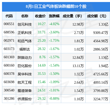 8月1日工业气体板块较上一交易日下跌0.0%,创元科技领跌。当日上证指数报收于3290.95,下跌0.0%。深证成指报收于11143.23,下跌0.36%。工业气体板块个股涨跌见下表: