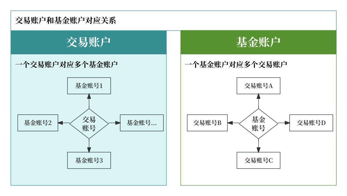 1)基金账户:TA对应一个基金账户。基金交易账户和基金账户是一对多关系。用户在XX开通基金交易账户,买了3家基金公司基金,就开了3个基金账户。