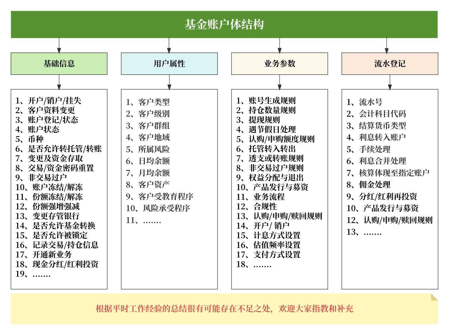 1)基金账户结构都包含四个方面:详情见下图,账户结构是证券基金投资中重要组成部分。还可以根据业务需要按交易渠道、交易金额、客户级别、存期等多个维度,设置不同的账户。这块不好把握,功能点多,不展开过多分析,有机会我们一起交流和学习。