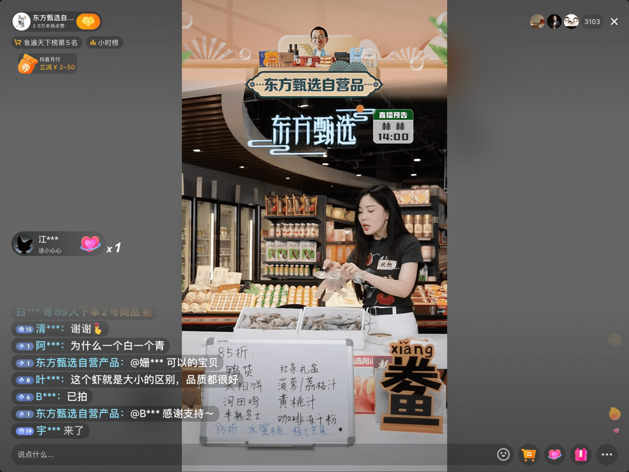 8月1日下午抖音帐号“东方甄选自营产品”复播截图