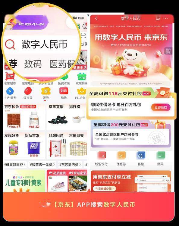一、打开【京东】App,通过页面上方搜索栏输入“数字人民币”,报名“绑民生借记卡 瓜分百万礼包”活动;