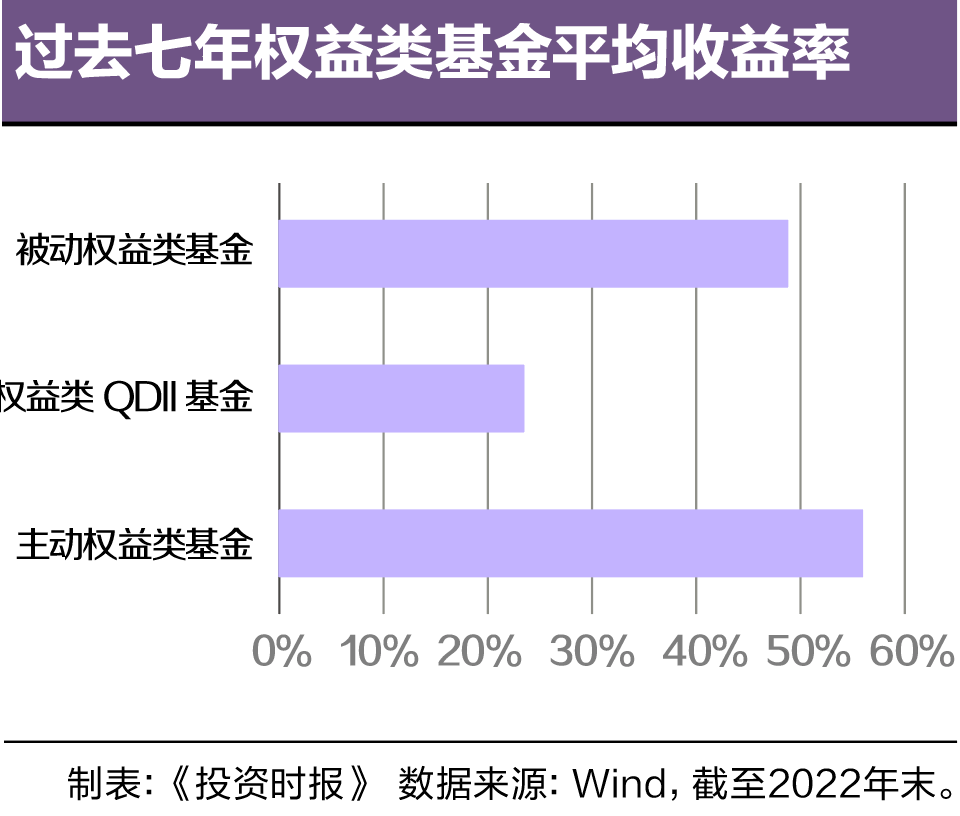 过去七年,A股主动权益类基金平均收益率最高,其次是权益类QDII,而A股被动权益类基金则略逊一筹