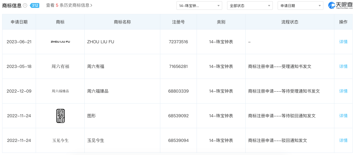 根据招股书信息,周六福的钻石镶嵌业务从2020年开始,营收出现持续降低,至2022年在总营收的占比已经由49.73%降至16.64%。根据今年钻石价格走势,预计2023年钻石镶嵌营业收入将会进一步下滑,至少通过天眼查,周六福新注册的商标信息中,已经很少涉及钻石产品。