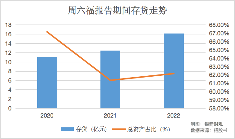 就像招股书中所提到的那样,存货高企压力长期笼罩在周六福的经营过程之中,不仅存货账面价值逐年增长,在总资产中的占比也持续在高位徘徊。