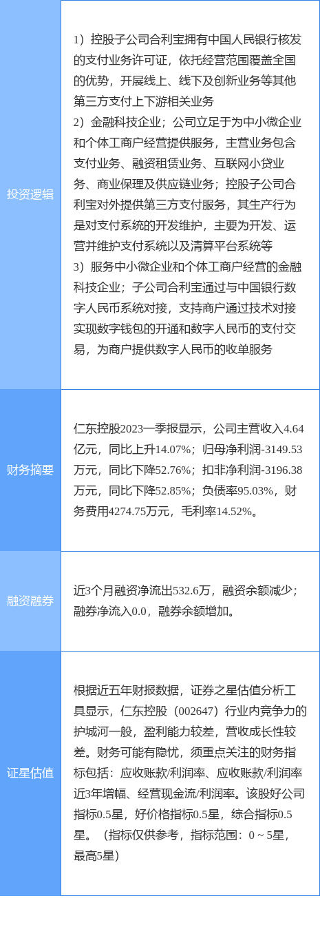 仁东控股涨停收盘,收盘价6.47元。该股于10点1分涨停,1次打开涨停,截止收盘封单资金为2676.14万元,占其流通市值0.74%。