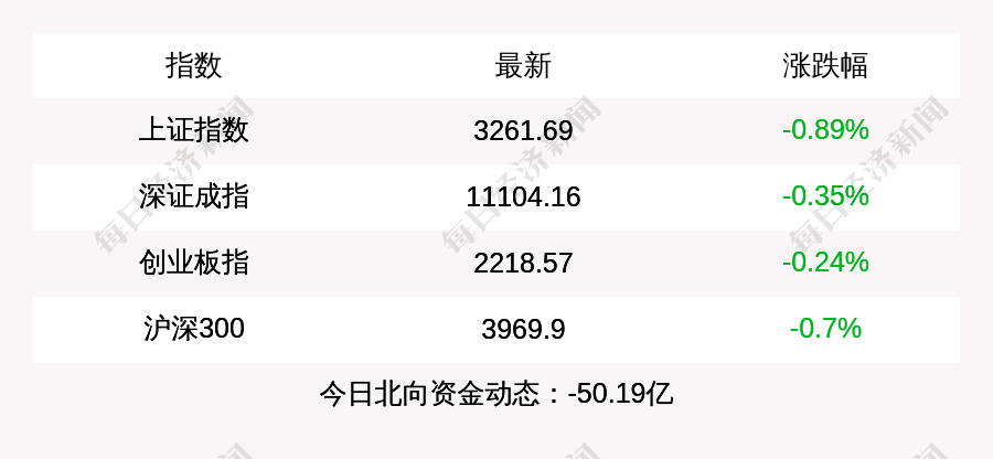北京时间8月2日15:00,上证指数收盘下跌29.26点,跌幅为0.89%,报收3261.69点,成交额3889.53亿元;深证成指收盘下跌39.07点,跌幅为0.35%,报收11104.16点,成交额4470.62亿元;创业板指收盘下跌5.23点,跌幅为0.24%,报收2218.57点,成交额1787.31亿元;沪深300收盘下跌28.1点,跌幅为0.7%,报收3969.9点,成交额2048.76亿元。