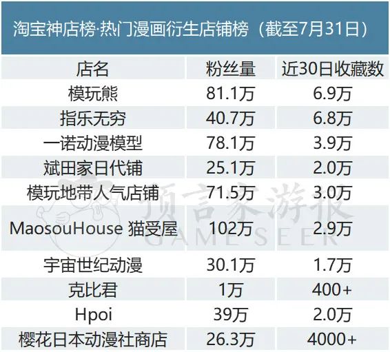 热门漫画衍生店铺榜的第6名至第10名则分别为MaosouHouse猫受屋、宇宙世纪动漫、克比君、Hpoi、樱花日本动漫社商店。其中Hpoi为本月新上榜店铺,本店销量最高的是模型高达手办刷,月销300+。
