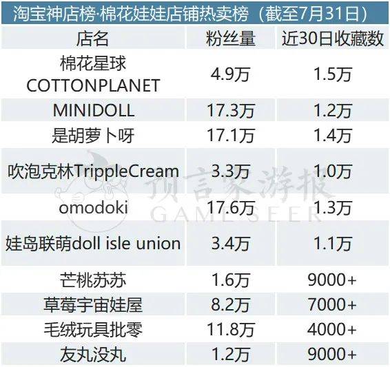 其余入榜的店铺分别为是胡萝卜呀、吹泡克林TrippleCream、omodoki、娃岛联萌doll isle union、芒桃苏苏、草莓宇宙娃屋、毛绒玩具批零、友丸没丸。
