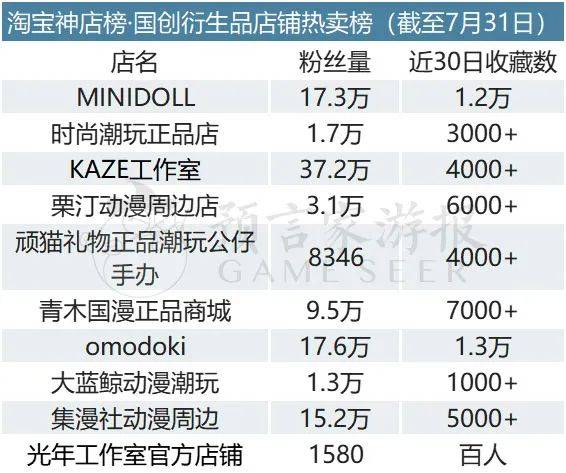 其他前十的店铺分别为时尚潮玩正品店、栗汀动漫周边店、顽猫礼物正品潮玩公仔手办、青木国漫正品商城、omodoki、大蓝鲸动漫潮玩、集漫社动漫周边、光年工作室官方店铺。