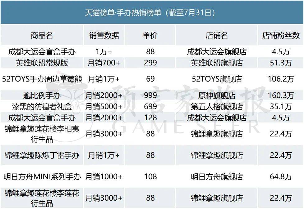 英雄联盟LOL咖啡甜心格温手办占据第二名,热销700+。原神旗舰店的魈比例手办、第五人格旗舰店的漆黑的彷徨者礼盒、明日方舟旗舰店的明日方舟MINI系列手办分别占据了第4位、第5位、第9位的名次。