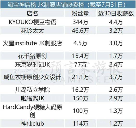 前十位分别是KYOUKO梗豆物语、花铃太太、火星institute JK制服店、花千猪原创、东京岁时记JK、咸鱼衣橱原创少女设计、川岛私立学院、啦啦酱JK、HardCandy硬糖大码原创、神仙club。