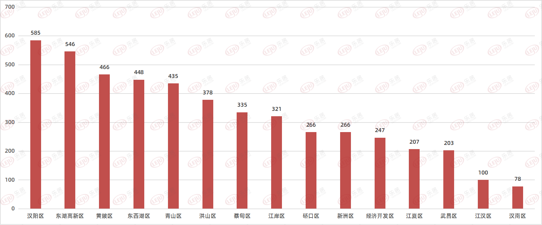 从区域成交上来看,15个区中新房住宅网签量过500套的仅有汉阳区和东西湖区,网签量300套以下的区域占了近一半,100套以下的仅汉南区。