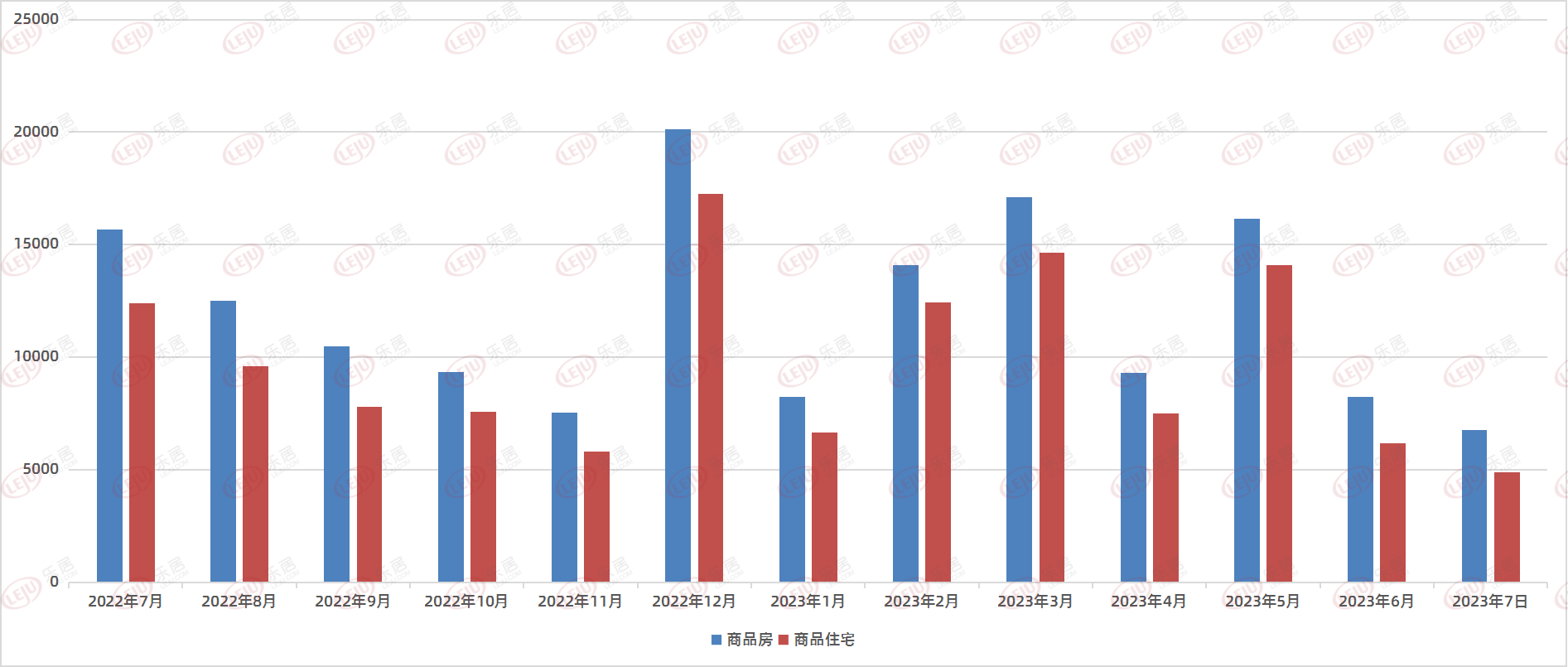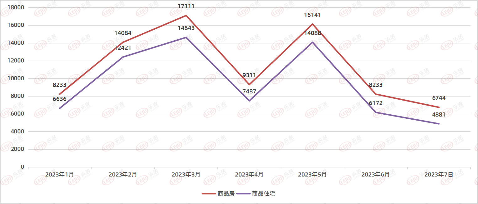 其中,新建商品住房成交4881套,相较于6月份新建商品住房成交6172套, 环比下降约21%,另外相较于2022年6月新建商品住房成交12393套,同比下降约60%。