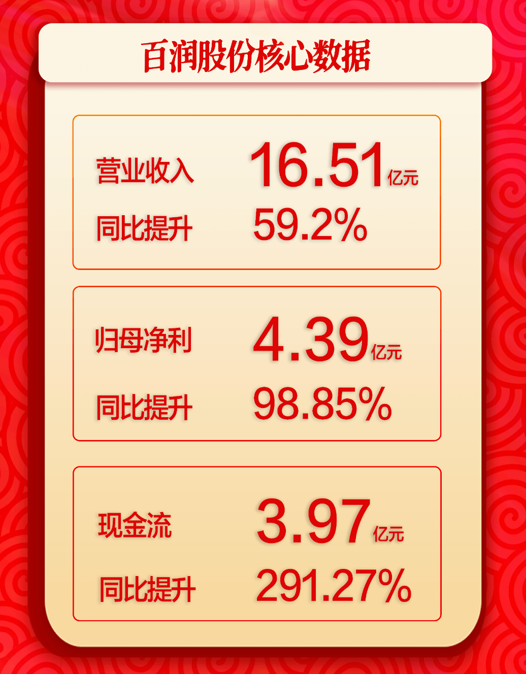 2023年上半年,百润股份实现营业收入约16.51亿元,同比增长59.2%;归属于上市公司股东的净利润约4.39亿元,同比增长98.85%。