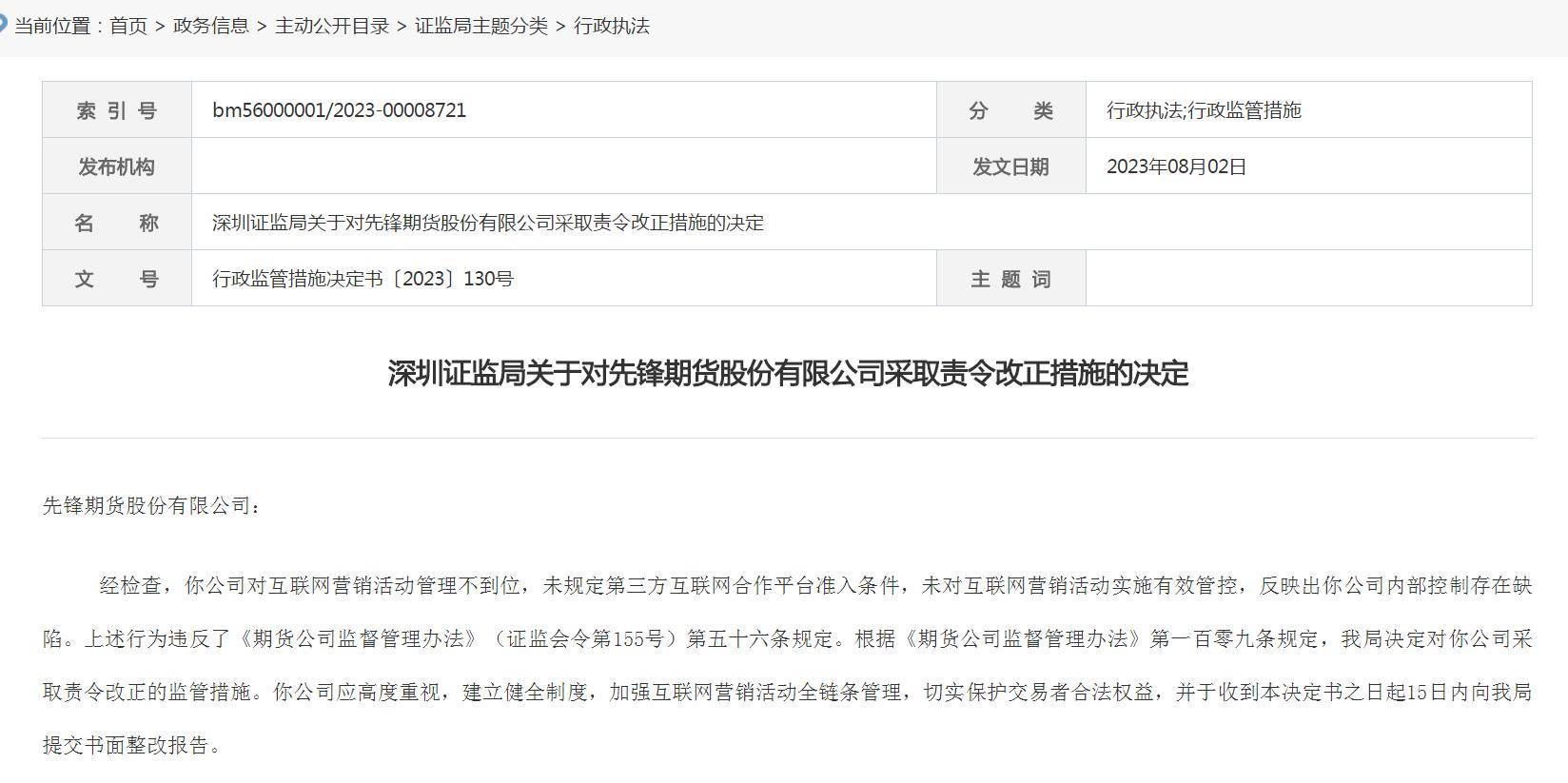 深圳证监局要求先锋期货高度重视,建立健全制度,加强互联网营销活动全链条管理,切实保护交易者合法权益,并于收到本决定书之日起15日内提交书面整改报告。