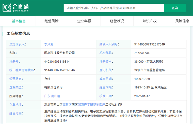 固高科技股份有限公司成立于1999年10月29日,地址位于深圳市南山区高新区南区深港产学研基地西座二楼W211室,法定代表人李泽湘,经营范围为生产经营运动控制器及相关产品、电子加工及智能制造设备、计算机软件及自动化技术开发、节能环保技术开发、技术咨询与服务;教育教学检测和评价活动。(除依法须经批准的项目外,凭营业执照依法自主开展经营活动)。
