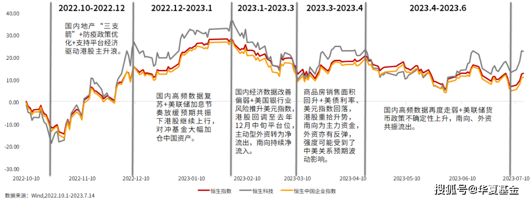 复盘自2022年11月以来港股市场情况,受内外因素扰动,港股市场可谓“一波三折”。以恒生指数为例,港股自去年10月底14500点开始反弹,到1月底一度接近23000点,后来开始再度调整,年内低点18000出现在5月底,投资者情绪也陷入极度悲观。