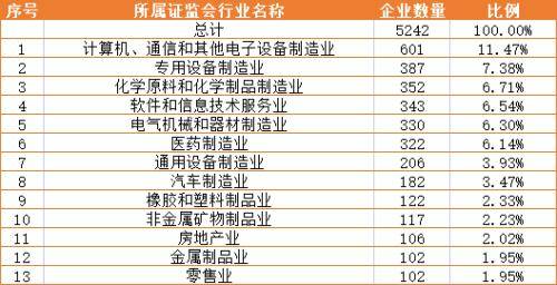 其中计算机、通信和其他电子设备制造业的企业数量最多,达到了11.47%。需要指出的是,次新股中该行业的企业数量占比更是高达21.89%,换句来说,近一年新上市公司中,每5家便有一家属于该行业。