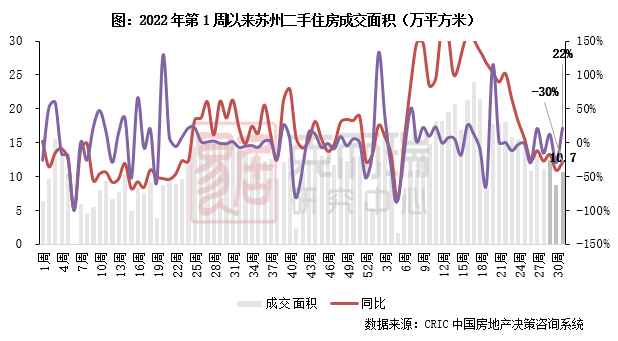 2023年第31周,苏州二手住房成交面积10.7万平方米,环比增长22%,同比下降30%,同比跌幅仍然居各重点城市前列。