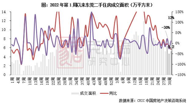 2023年第31周,东莞二手住房成交面积5.2万平方米,规模重归5万平以上,环比增长12%,同比下降30%,跌幅还在走阔。