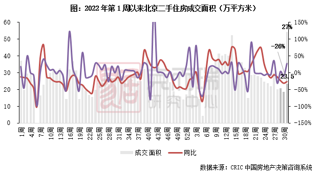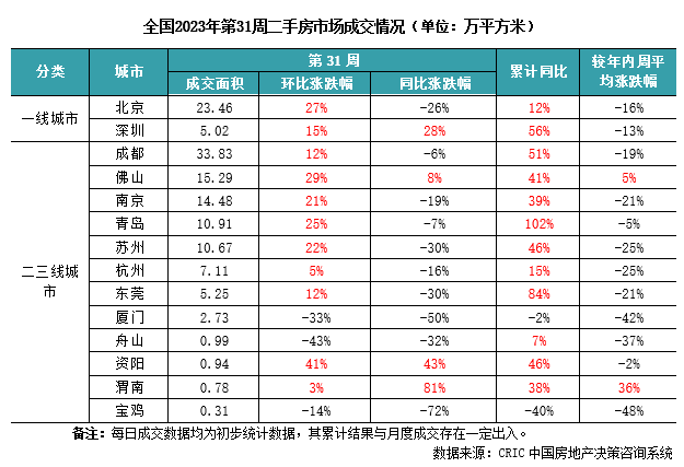 2023年第31周,北京二手房成交面积23.5万平方米,是7月以来的单周最高,环比增长27%,同比下降26%。