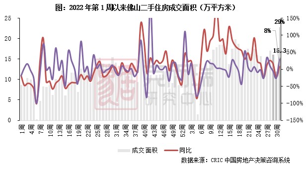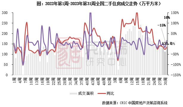 2023年第31周,佛山二手住房成交面积15.3万平方米,同、环比均由降转升,环比增长29%,同比增长8%,较年内周平均增长5%。