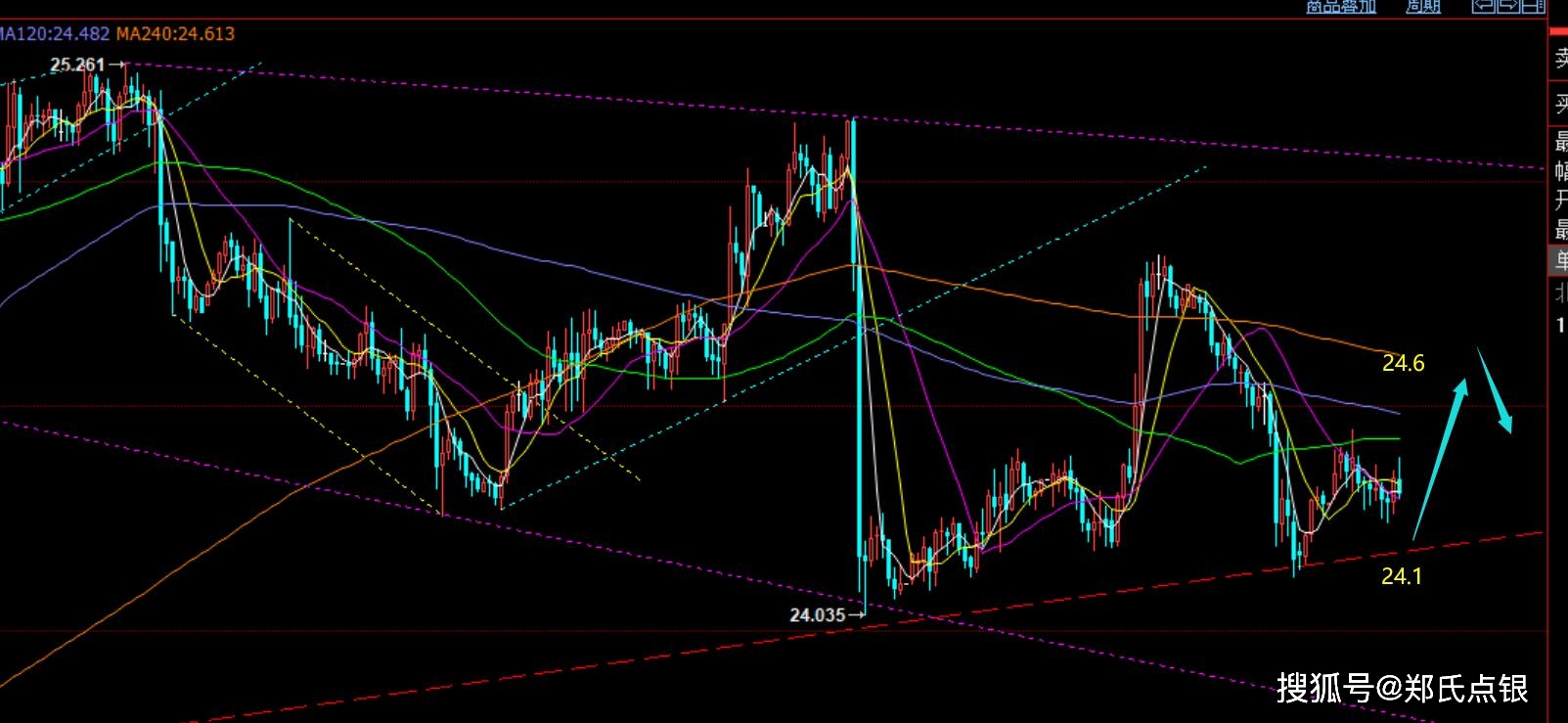 第二,白银方面: 昨日也是一样,失守24.45支撑,最低打到24.1才企稳;