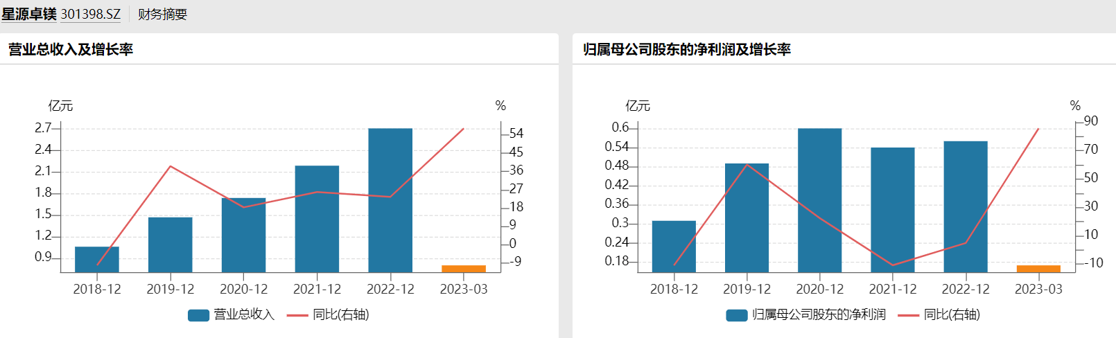 业绩方面,星源卓镁最近一年、一期均实现营利双增。其中2023年第一季度,公司实现营收0.8亿元,同比增57.23%;归母净利润0.17亿元,同比增85.74%。