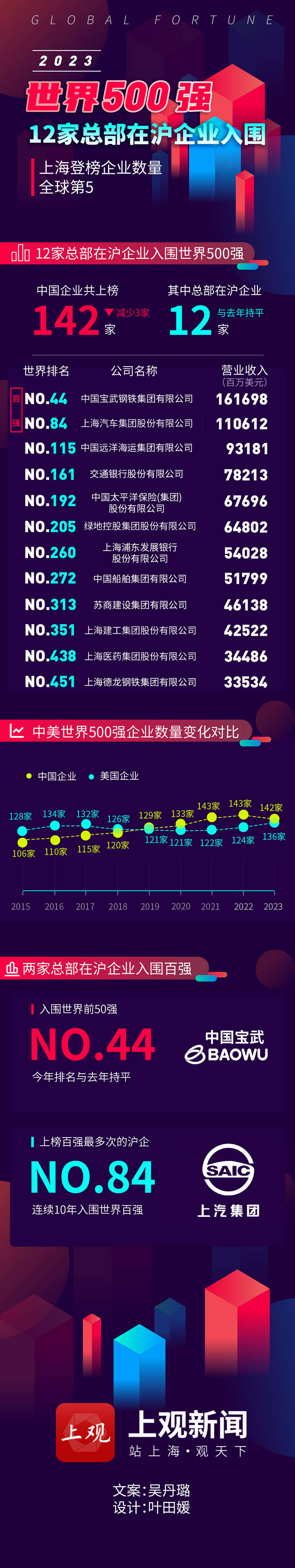 对比去年《财富》公布的世界500强企业榜单,今年总部在沪入围企业仍是12家,与去年入围企业名单相同,按照今年的排名依次是中国宝武(44)、上汽集团(84)、中远海运(115)、交通银行(161)、太平洋保险(192)、绿地控股(205)、浦发银行(260)、中国船舶(272)、苏商建设(313)、上海建工(351)、上海医药(438)、德龙钢铁(451)。