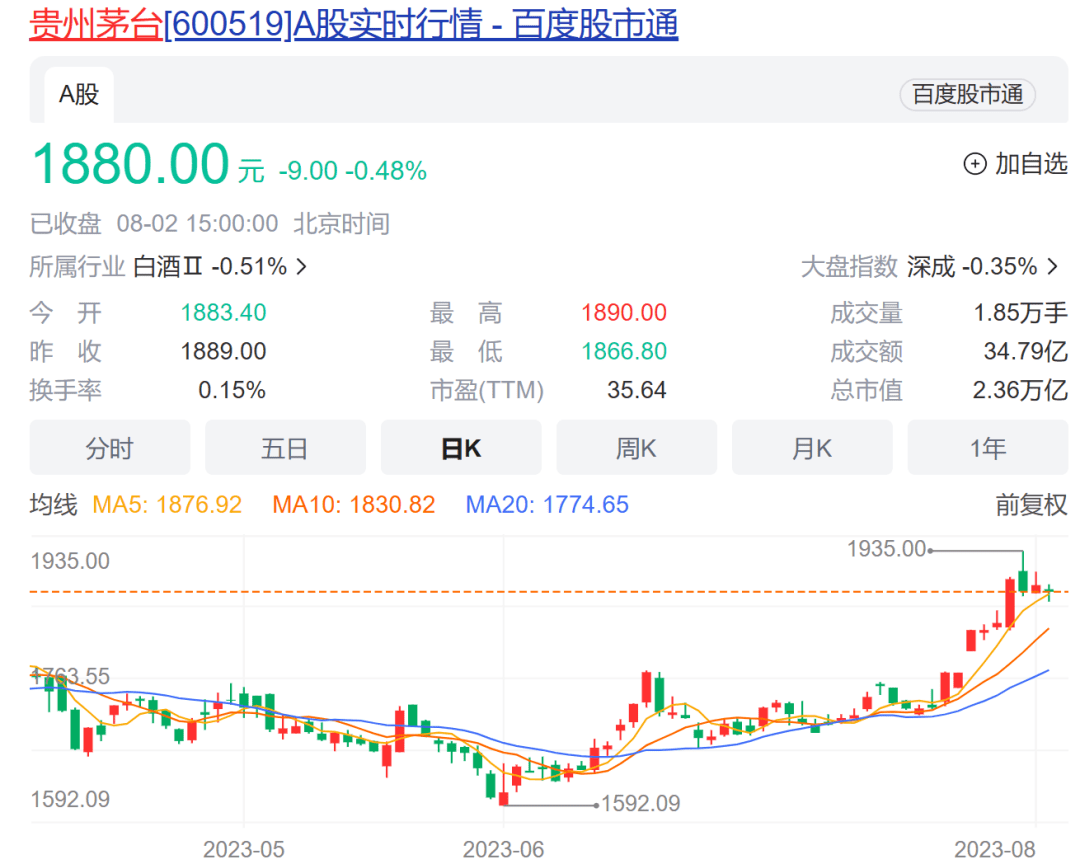 市场表现来看,贵州茅台自第三季度以来,股价已经反弹约11%,最新报收1880元/股。
