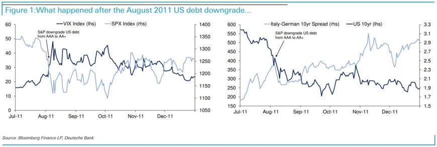 德意志银行策略师Jim Reid写道,这些图表“显示了2011年8月5日前后发生的事情,当时标普全球做出了同样的降级决定,这一决定也是在紧张的债务上限谈判之后做出的(尽管谈判在降级前几天才成功结束)。鉴于距离降级的时间很近,并且激烈的谈判仍在持续,7月份市场情绪疲弱”。